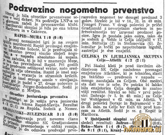 1. Rapid 1 1 0 0 1:0 2 2. Železničar 1 0 1 0 3:3 1 3. Građanski 1 0 1 0 3:3 1 4. Mura 1 0 0 1 0:1 0 5. Maribor 0 0 0 0 0:0 0 6. ČŠK 0 0 0 0 0:0 0