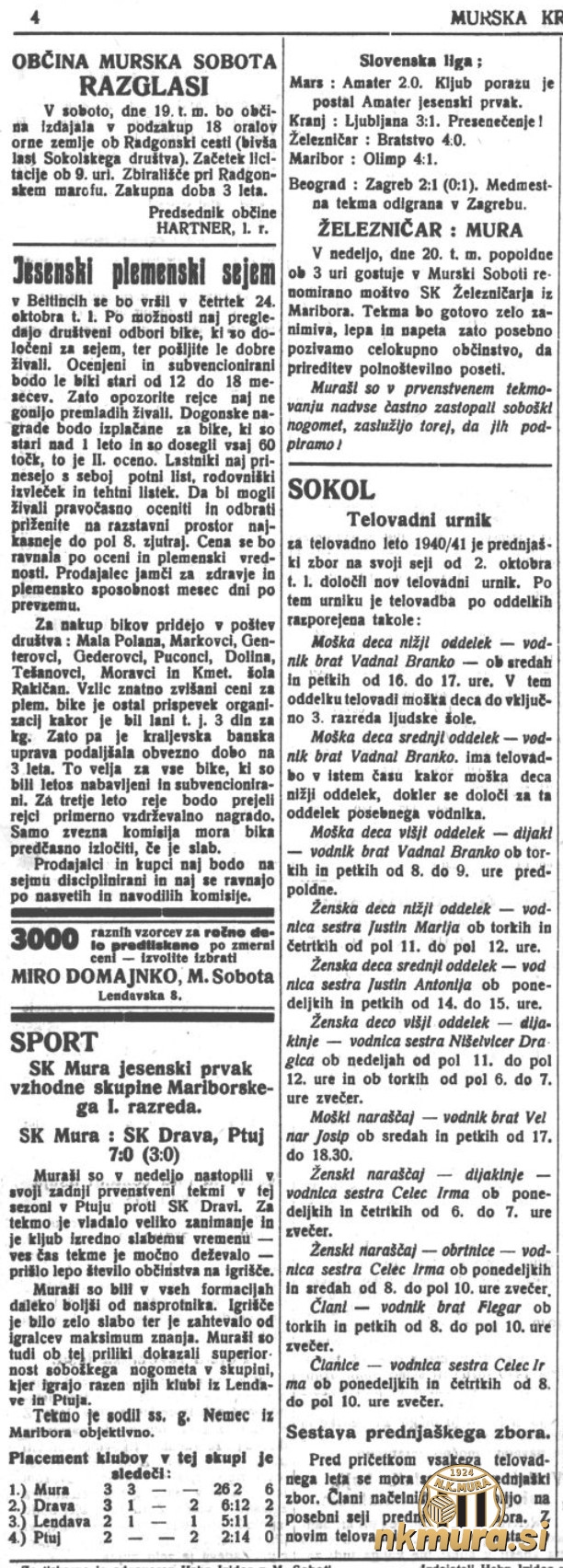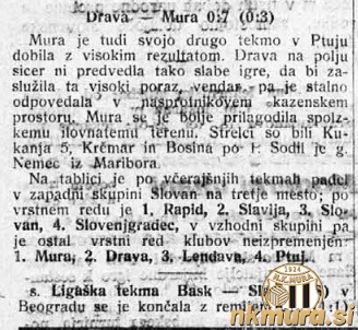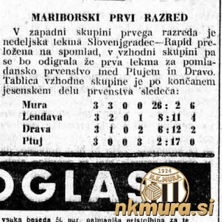Nogometaši Mure so se v zadnji prvenstveni tekmi to jesen odpravili na Ptuj k Dravi in zmagali z visokih 0:7 (0:3). Tekma je bila odigrana na Ptuju na igrišču Ljudski vrt. Na tekmo so se opravili z vlakom ob 10.22.