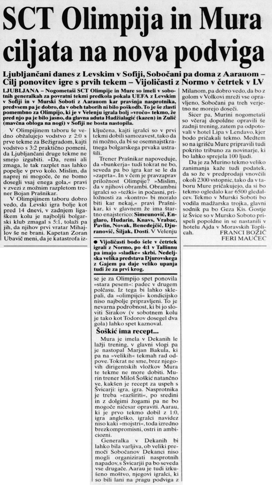 Nogometaši Mure bodo danes igrali povratno tekmo predkroga pokala UEFA s švicarskim Aarauom. Na prvi tekmi so zmagali švicarji z 1:0. Kakšen recept bo uporabil strateg Mure Miloš Šoškič?