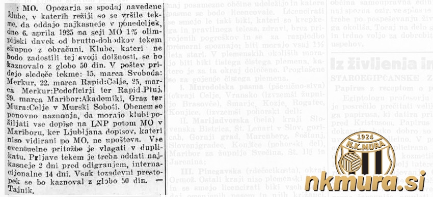 Vodstvo tekmovanja v mariborskem okrožju (MO) poziva vse klube, ki so organizirali tekme, da do ponedeljka 6. aprila 1925 plačajo 1% olimpijski davek od bruto dohodkov na tekmi. Poziv velja tudi za Muro, ki se je na prijateljski tekmi pomerila s Celjem. V primeru neizpolnjevanja obveznosti bodo klubi kaznovani z denarno kaznijo 50 dinarjev.