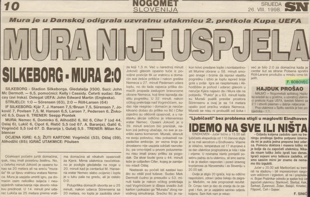 Nogometaši Mure so doživeli poraz na Danskem proti Silkeborgu in se niso uspeli uvrstiti v naslednji krog pokala UEFA. Usodni sta bili dve minuti (63. in 64. minuta), ko so prejeli dva zadetka.