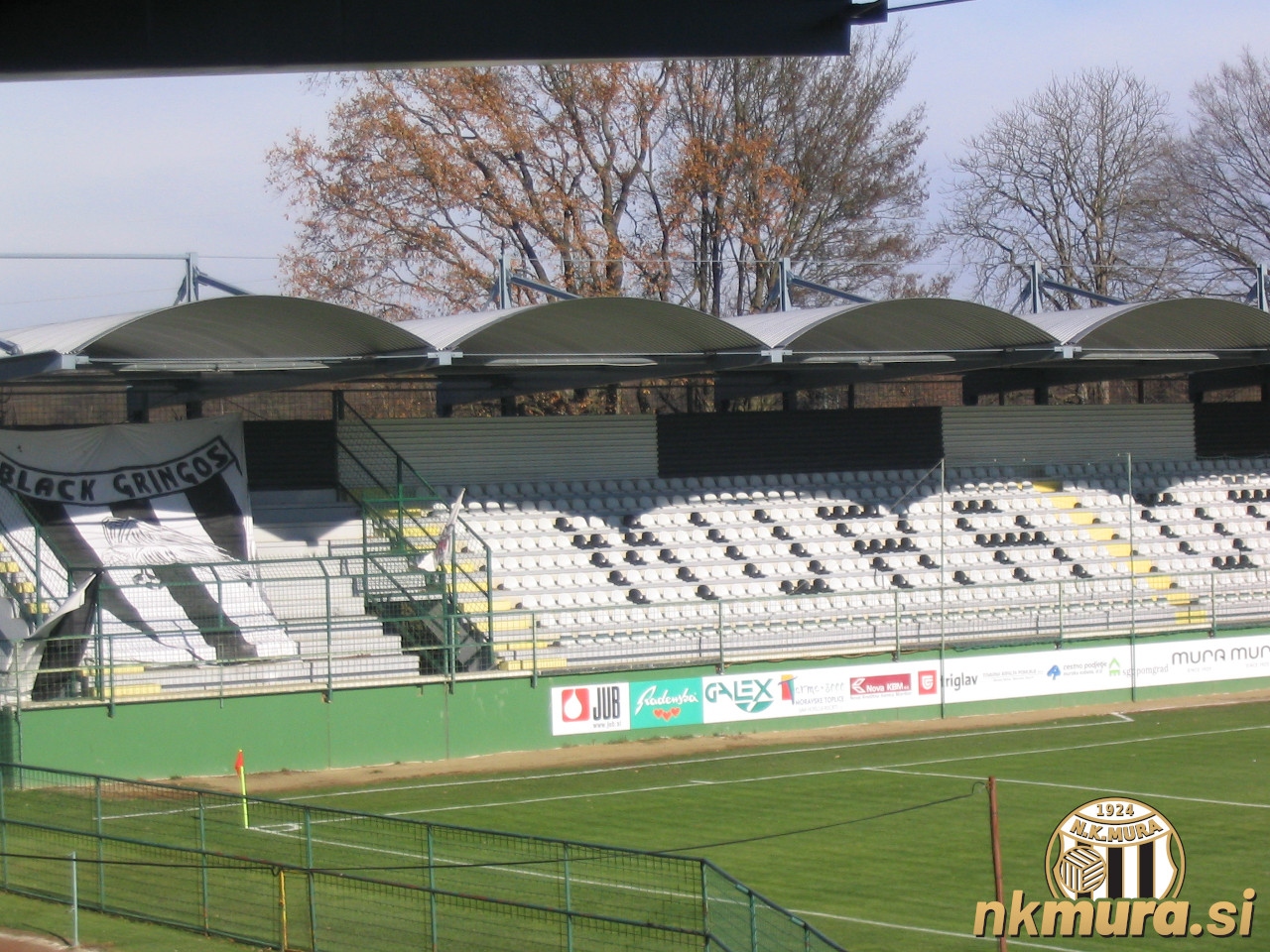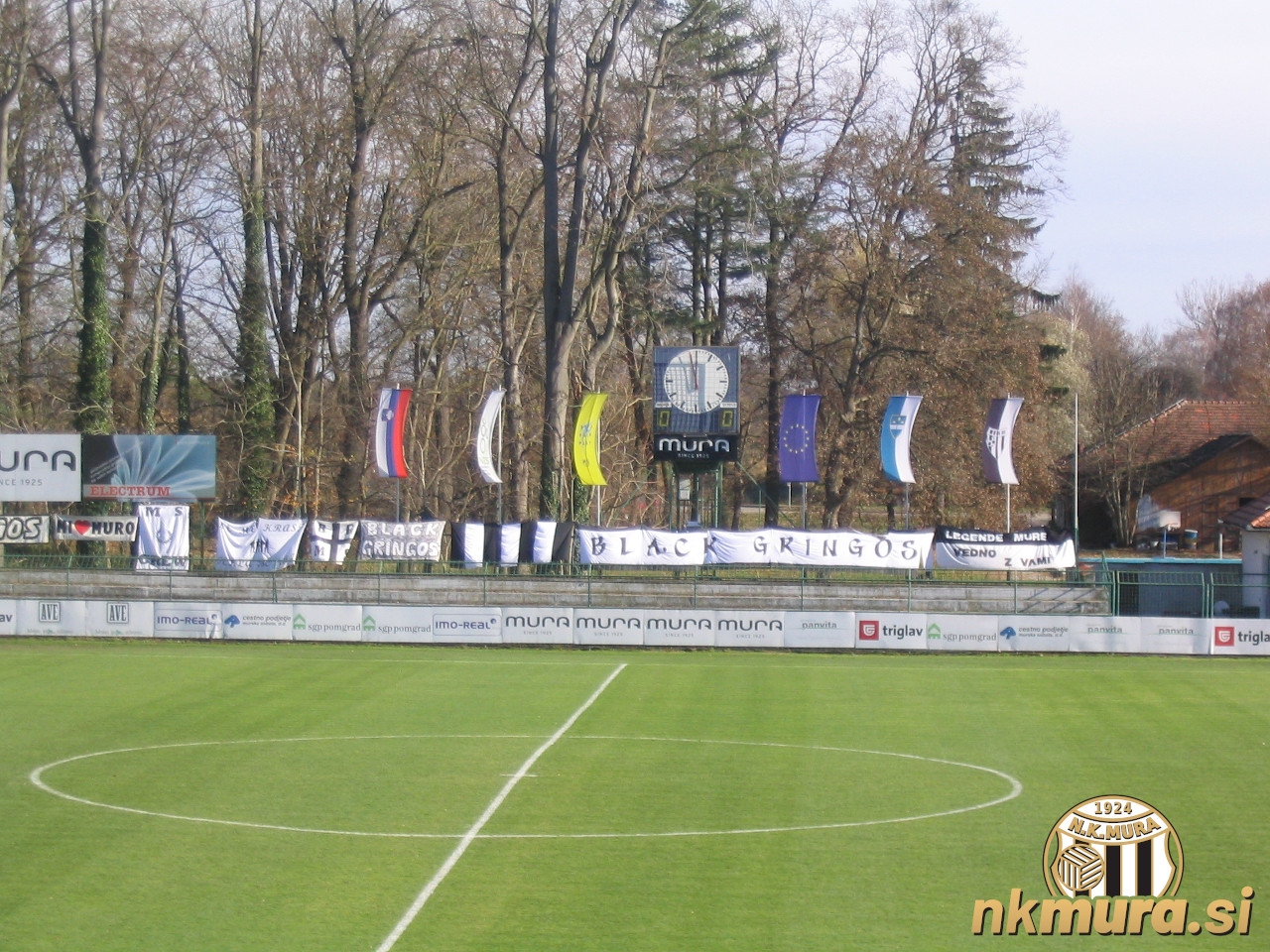 Zaradi kazni je bila tekma odigrana brez gledalcev. Navijaška skupina Black Gringos je na stadionu izobesila transparente in veliko zastavo. Avtorske pravice: nkmura.si Foto: arhiv NK Mura skozi čas