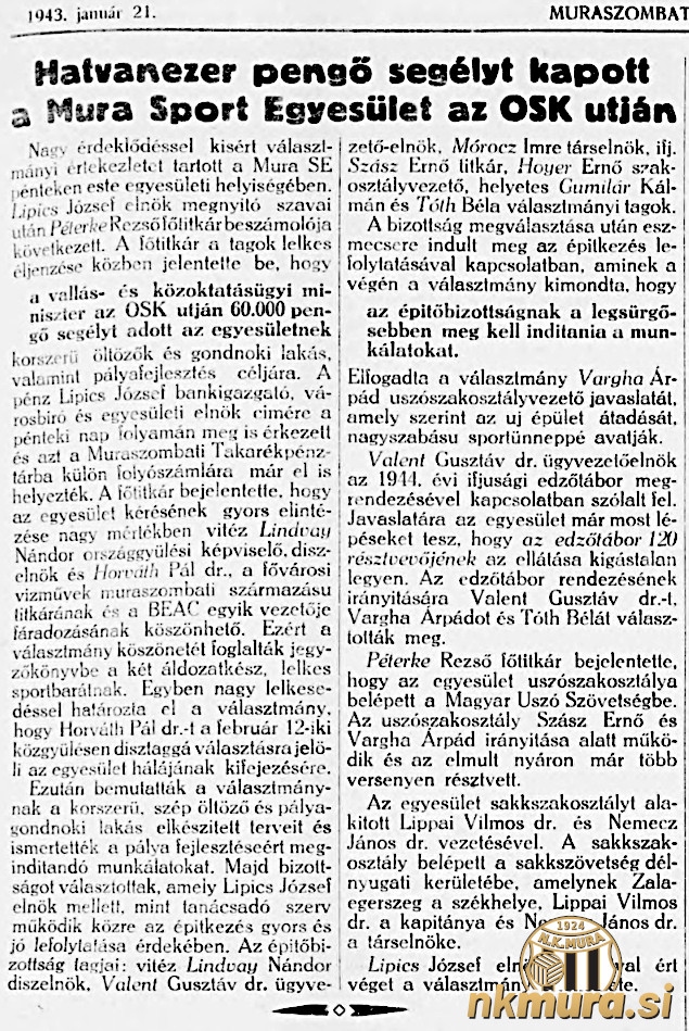 V petek, 14. januarja 1944, se je v prostorih kluba odvijal sestanek vodstva kluba. Na njem je sekretar kluba Raoul Peterka sporočil, da je Mura za gradnjo garderob, stanovanje hišnika in razvoj kluba prejela 60.000 pengov. Denar je zagotovil minister za vero in javno šolstvo Madžarske in sicer prek nacionalnega športnega centra (OSK oz. Országos Sport Központ). Sredstva so že na naslovu kluba in predsednik Josip Lipič ga je položil na ločen račun soboške hranilnice.