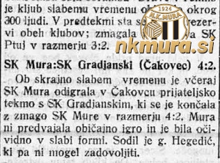Nogometaši Mure so se še drugič v kratkem času pomerili z Građanskim iz Čakovca. Tokrat so v Čakovcu zmagali z 2:4. Tekma se je odvijala v zelo slabem vremenu, črno-beli pa je niso odigrali tako kot znajo, saj je bilo veliko napak v igri.