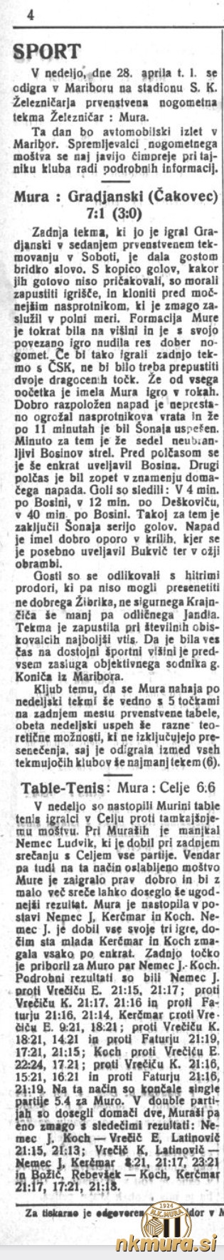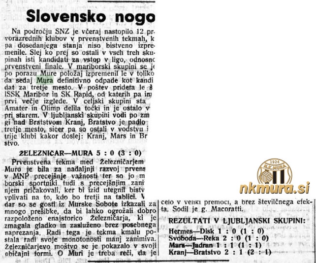 SK Mura je na dan tekme priredila avtomobilski izlet v Maribor. Vsi, ki so želeli biti spremljevalci nogometnega moštva so se morali javiti pri tajniku kluba. Sicer pa si je Železničar zmago povsem zaslužil. Sobočani se niso najbolje znašli na razmočenem terenu, svoje pa je dodala še utrudljiva vožnja.