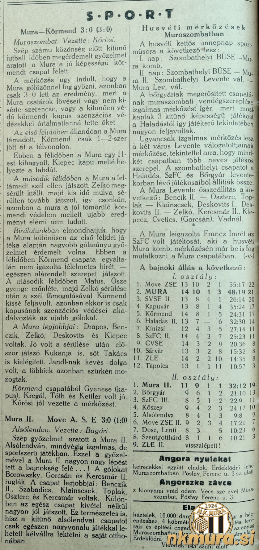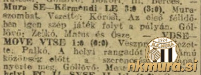V 14. krogu prvenstva v sezoni 1943/44 je Mura v Murski Soboti gostila Körmendi in zmagala s 3:0. Vsi trije zadetki so bili doseženi že v prvem polčasu. Z zmago Mura še naprej ostaja na 2. mestu prvenstvene razpredelnice.