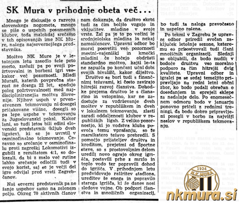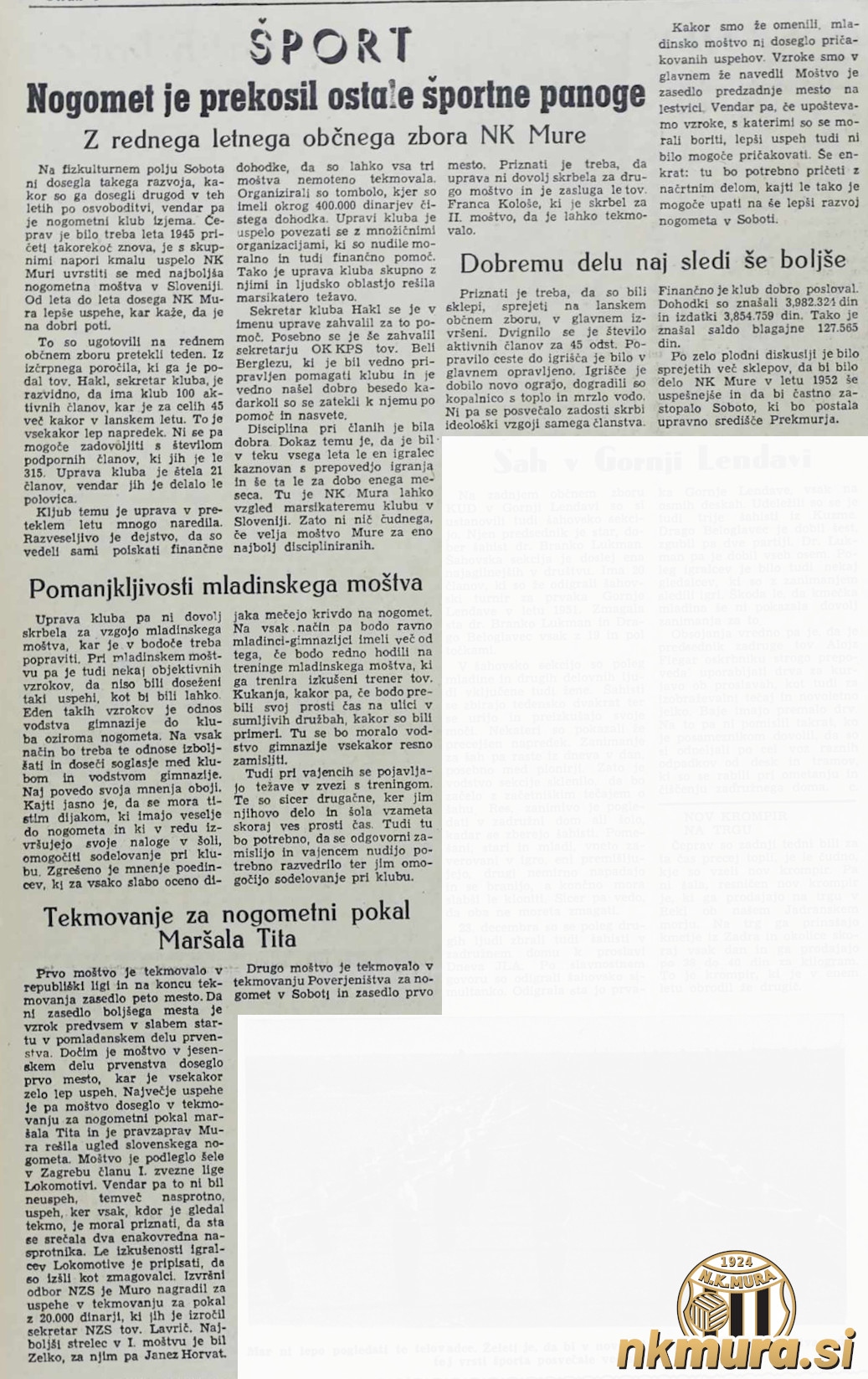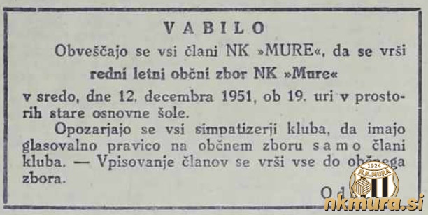 V prostorih stare osnovne šole v Murski Soboti je 12. decembra 1951 ob 19.00 potekal redni letni občni zbor NK Mure. Člani so za predsednika znova izvolili Milana Šušteršiča.