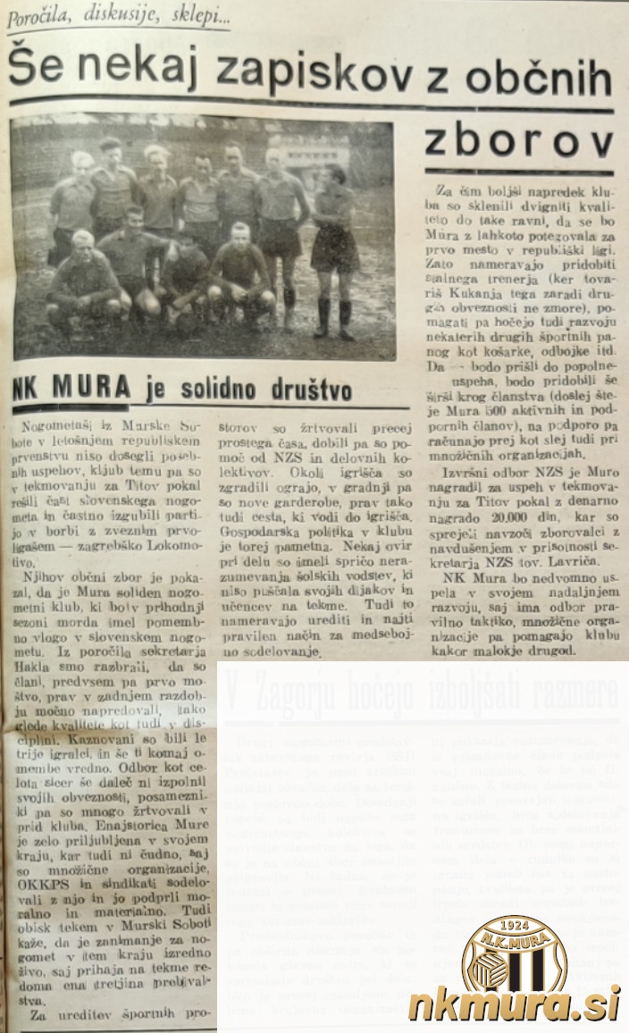 Kot smo omenili je Mura tekmovala s tremi moštvi. Prvo moštvo je v slovenski republiški ligi zasedlo solidno peto mesto, povprečna starost ekipe pa je bila 22 let. Trener ekipe je bil Vladimir Kukanja. Mura je bila najuspešnejša ekipa jesenskega dela sezone. Prvi strelec je bil Feri Zelko, drugi pa Janez Horvat. Drugo moštvo je tekmovalo v nogometnem prvenstvu Poverjeništva Murska Sobota in prepričljivo zasedlo prvo mesto. Za to moštvo je skrbel nekdanji igralec Mure in nogometni sodnik Franc Kološa.