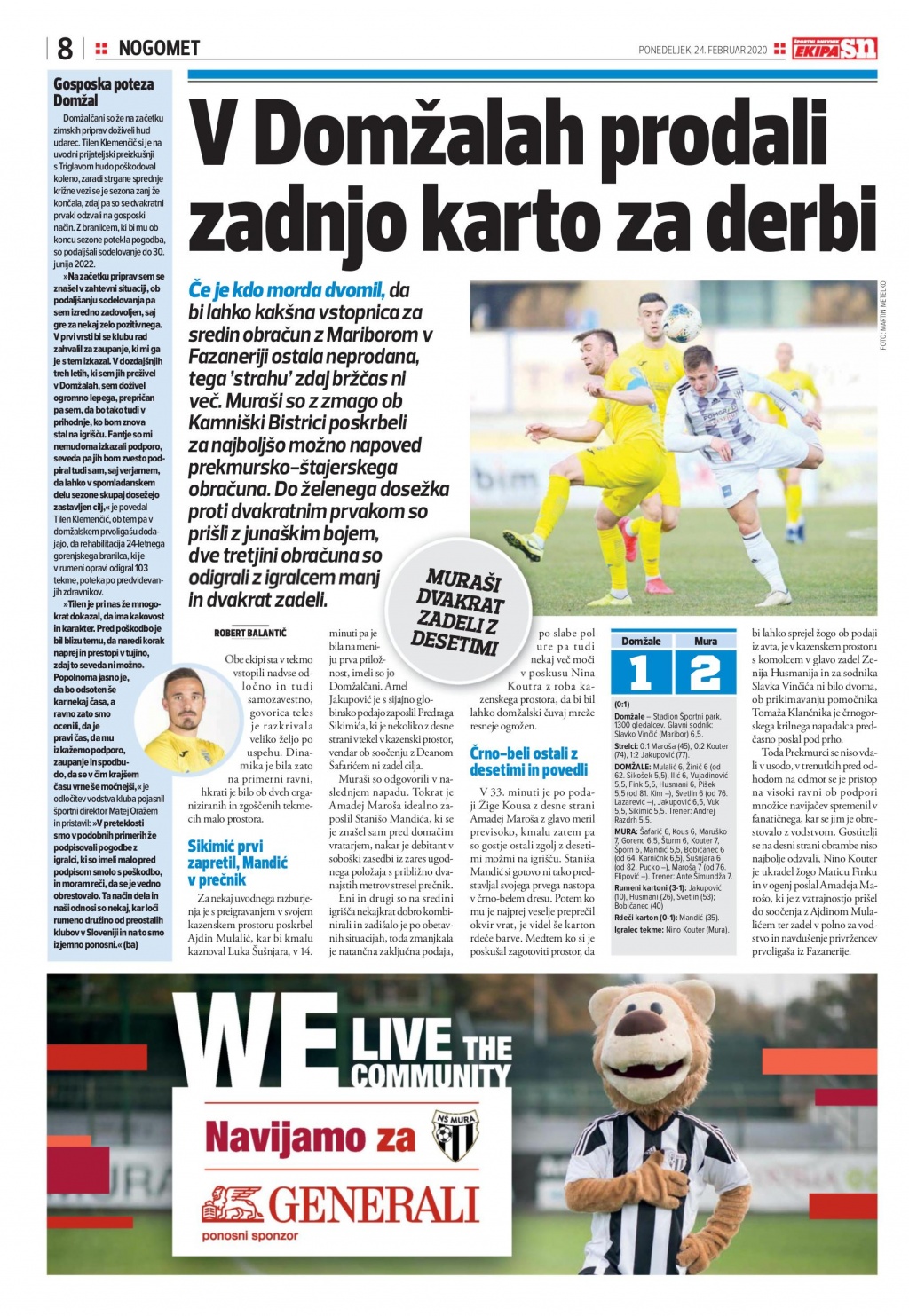 Prvi medsebojni dvoboj sezone se je v Domžalah končal z 0:0, a so nato jeseni bolje igrali črno-beli, ki so pred domačimi gledalci Domžalčane ugnali s 3:0. Tokrat je dvoboj sosedov na lestvici, Domžale so šeste, Mura pa peta, dobili slednji, pa čeprav so od 35. minute igrali z igralcem manj. Tako so se Domžalam, ki so doživele deseti poraz, oddaljili že za devet točk in ohranili stik z vodilnimi ekipami.