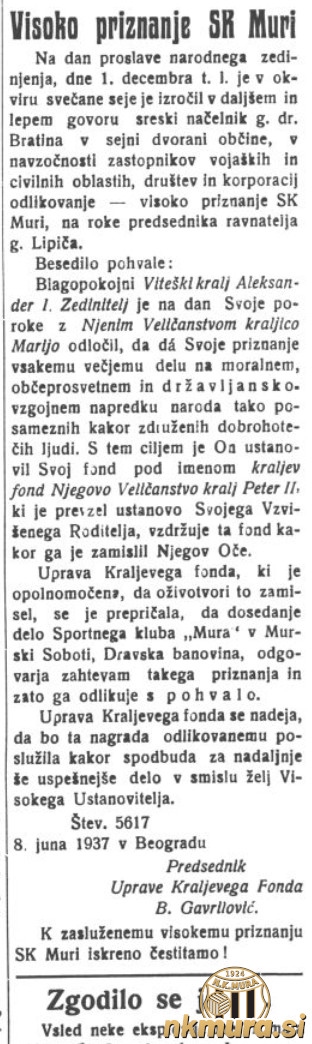Junija 1937 je Uprava Kraljevega fonda sporočila, da je Mura za svoje udejstvovanje in delovanje prejela pohvalo. Klubu je bila izročena na prireditvi, ki je potekala 1. decembra 1937, na dan državnega praznika združitve Srbov, Hrvatov in Slovencev.