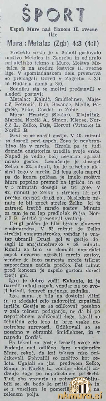 Nogometaši Mure so premor pred pokalno tekmo proti Tekstilcu izkoristili za prijateljski obračun z zagrebškim Metalcem. Muraši so ekipo, ki se nahaja na sredini drugoligaške lestvice premagali s 4:3 (4:1).