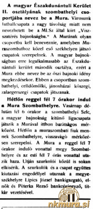 Madžarska nogometna zveza (MLSZ) je določila, da bo Mura v sezoni 1941/1942 tekmovala v II. razredu Severno podonavskega okrožja in sicer v južni skupini. Gre za podeželski nivo tekmovanja, kar na državnem nivoju predstavlja 5. ligo.