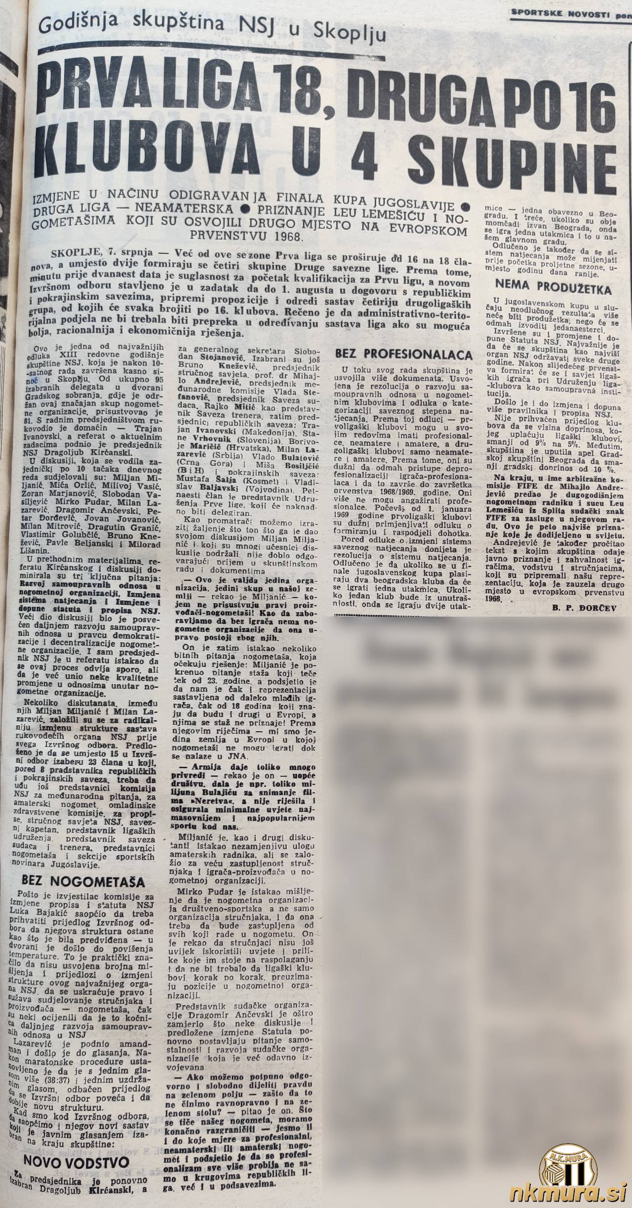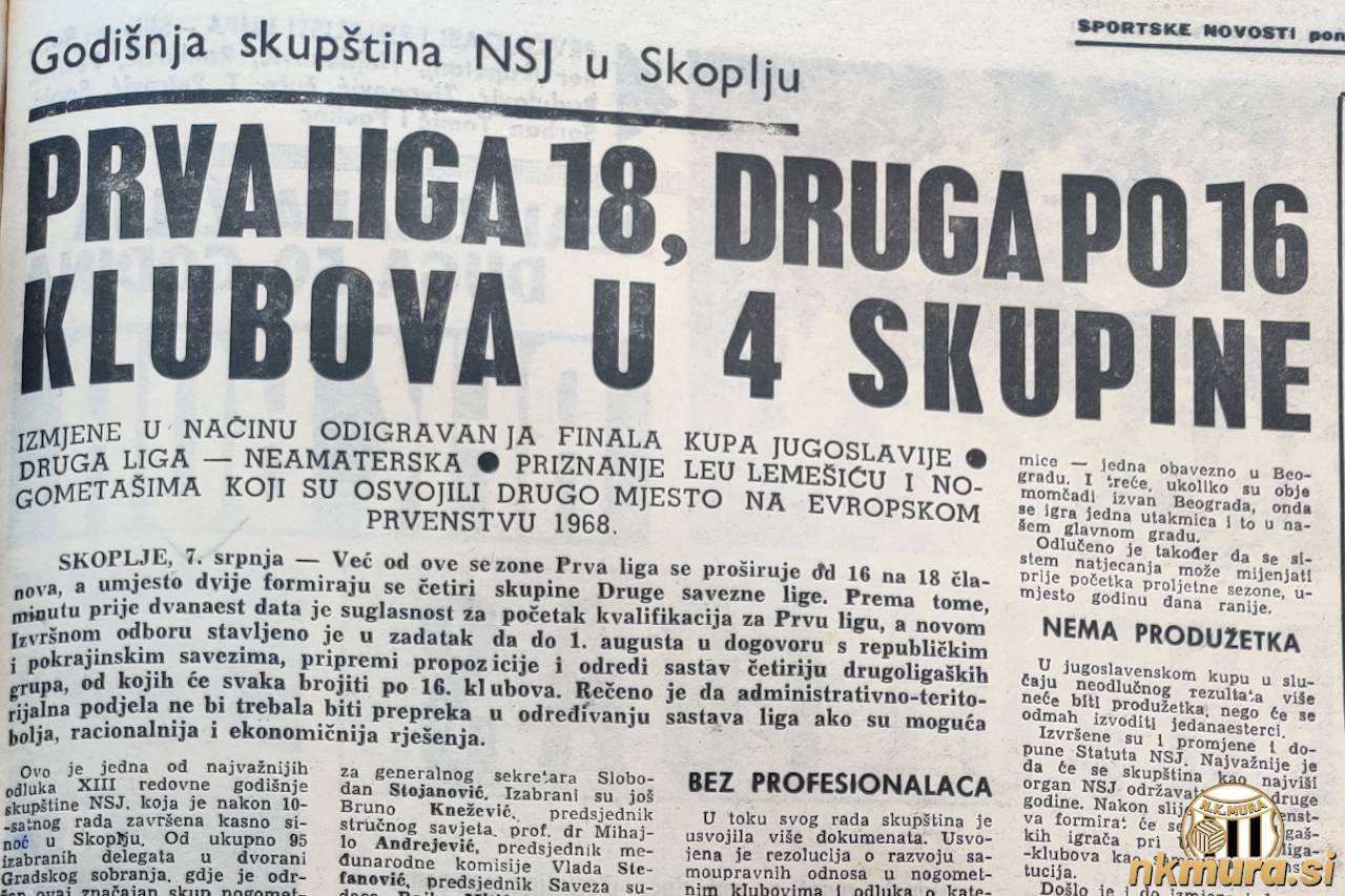 Na letni skupščini Nogometne zveze Jugoslavije v Skopju so sprejeli nekaj sklepov, ki bodo vplivali na tekmovanje v prihodnji sezoni 1968/69. Za Muro je najbolj zanimivo, da se bosta sedanji dve drugi zvezni ligi razdelili na štiri. Po nekaterih indicih bi se naj v drugo ligo neposredno uvrstili prvouvrščeni ekipi SNL, to sta Ljubljana in Mura.