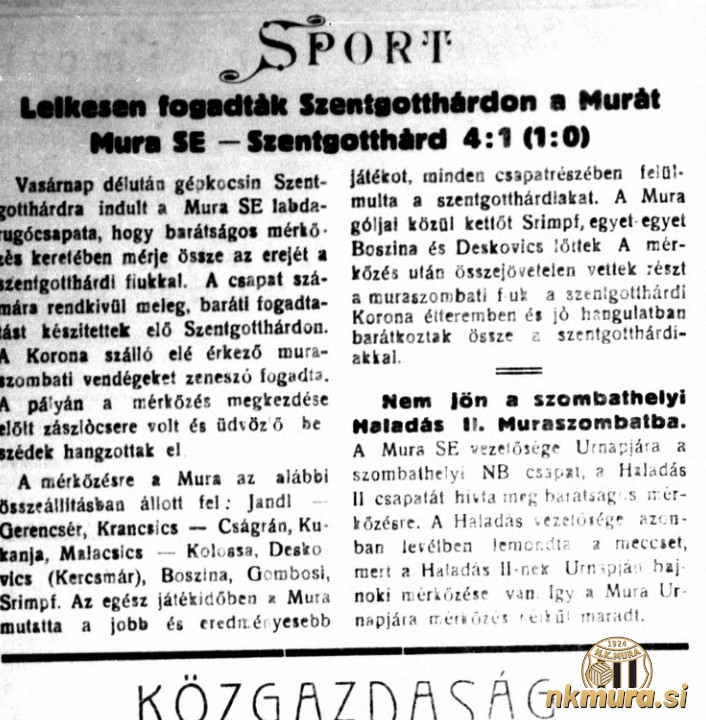 V četrti pripravljalni tekmi v sezoni 1941/1942, so se Muraši z avtomobili odpravili v Monošter, kjer so merili moči s tamkajšnjim klubom Szentgotthárdi, ki je bil ustanovljen že leta 1902. Črno-beli so slavili z 1:4 (0:1). Domačini so Muro v Monoštru sprejeli pred hotelom Korona.