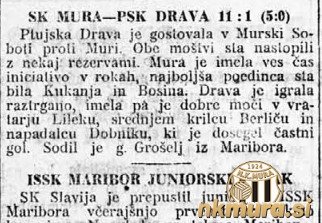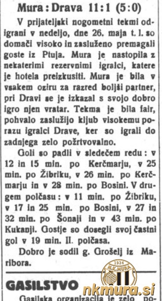 Nogometaši Mure so se v prijateljski nogometni tekmi pomerili z Dravo in zmagali z 11:1. Polčas se je končal s 5:0.