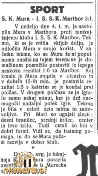 Nogometaši Mure so se v prijateljski nogometni tekmi pomerili z rezervno ekipo I.SSK Maribor in zmagali z 1:3. Tekmo je zaznamovalo močno deževje, ki je botrovalo temu, da sta ekipi odigrali le en polčas.