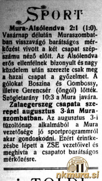 Nogometaši Mure so 20. julija 1941 v Murski Soboti igrali povratno prijateljsko tekmo proti Lendavi. Tako kot pred dvema tednoma so tudi tokrat slavili Sobočani in sicer z 2:1. Polčas se je končal 1:0.