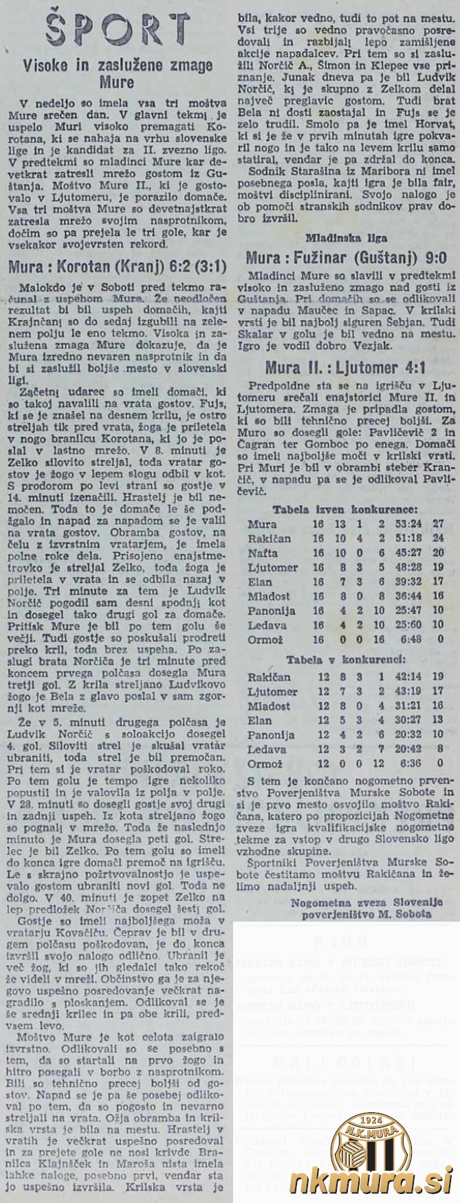 Lep uspeh prve ekipa dopolnila druga in mladinska ekipa. Mladinska ekipa je z 9:0 premagala Fužinar, druga pa s 4:1 Ljutomer. Za drugo ekipo so zadeli Pavličevič (2), Čagran in Gomboc. Druga ekipa je zasedla prvo mesto v nogometnem prvenstvu Poverjeništva Murska Sobota. V tej ligi sta Mura II in Nafta II tekmovala izven konkurence.