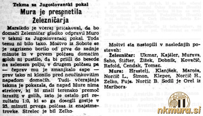 Nogometaši Mure so v Mariboru odigrali pokalno tekmo 1. kroga zaključne faze proti Železničarju in zmagali z 0:1 (0:1). Z zmago so se uvrstili v naslednji krog kjer jih na Fazaneriji čaka kranjski Korotan.