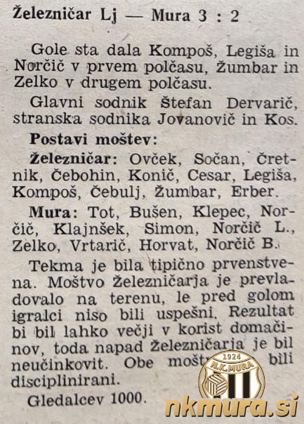 Nogometaši Mure so se v 4. krogu slovenske nogometne lige pomerili z Železničarjem iz Ljubljane. Tekmo, ki je bila odigrana v Ljubljani, so izgubili s 3:2 (2:1).