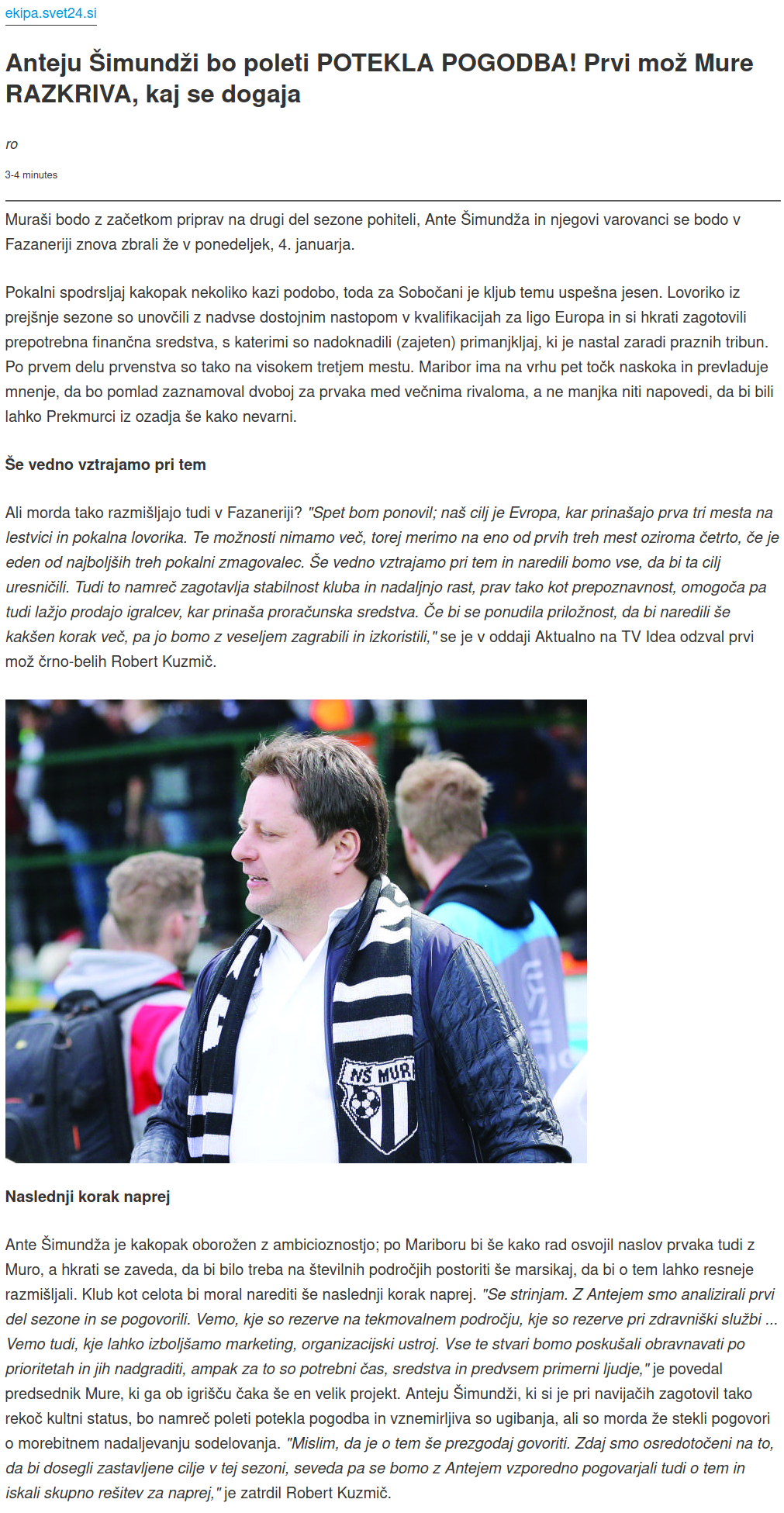 Dotaknil se je tudi Anteja Šimundže, ki mu poleti poteče pogodba z Muro: "Mislim, da je o tem še prezgodaj govoriti. Zdaj smo osredotočeni na to, da bi dosegli zastavljene cilje v tej sezoni, seveda pa se bomo z Antejem vzporedno pogovarjali tudi o tem in iskali skupno rešitev za naprej," je zatrdil Robert Kuzmič.