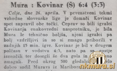 Nogometaši Mure so se prvič v zgodovini podali v Štore, kjer so se v prvenstveni tekmi pomerili s Kovinarjem. Po izenačenem prvem polčasu so slavili Muraši s 4:6 (3:3).