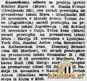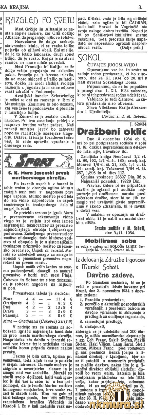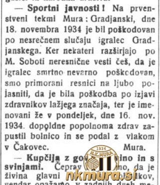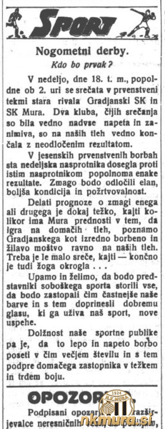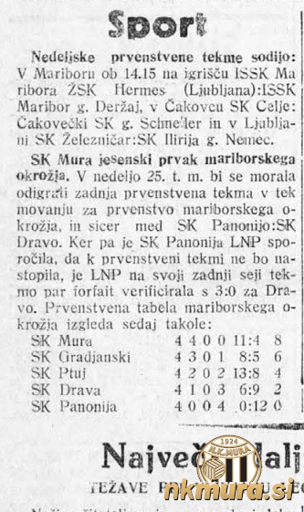 Nogometaši Mure so v derbiju zadnjega jesenskega kroga z 2:0 premagali Građanski iz Čakovca in s tem osvojili naslov jesenskega prvaka v II. razredu mariborskega okrožja. Črno-beli so jesenski naslov v sezoni 1934/1935 osvojili na najboljši možni način - z vsemi zmagami.