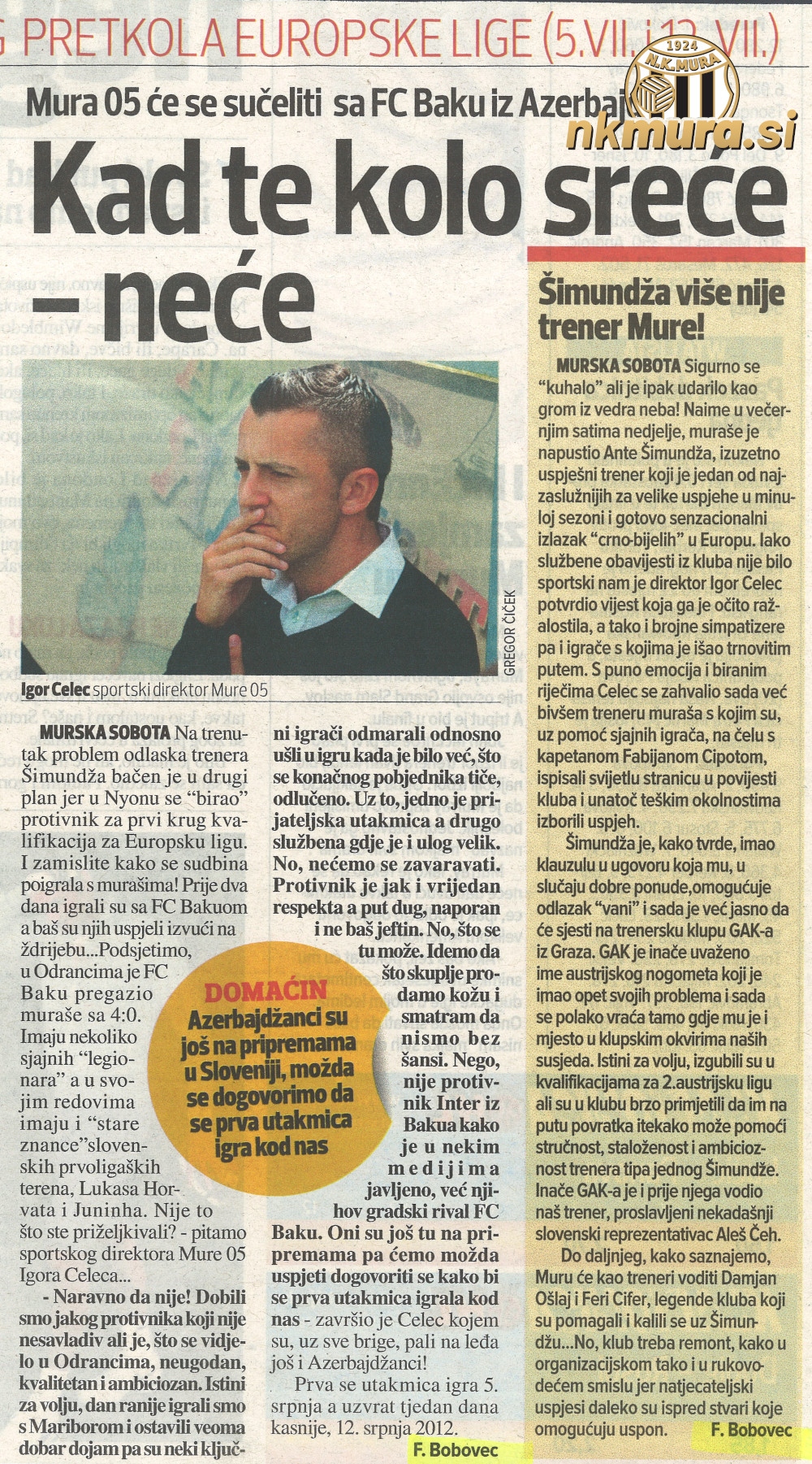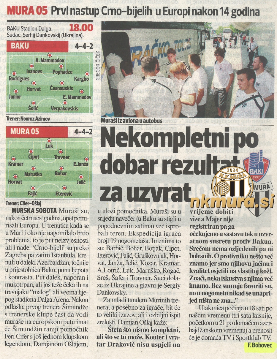 Nogometaši Mure so v sredo, 4. julija 2012 v poznih večernih urah vendarle prispeli v Baku, kjer bo odigrana prva tekma 1. kroga kvalifikacij za Ligo Europa. Muraši so na pot krenili ob sedmih zjutraj in v prestolnico Azerbajdžana potovali več kot dvanajst ur. Preleteli so več kot 4000 kilometrov, v Bakuju pa jih je pričakala nevihta.