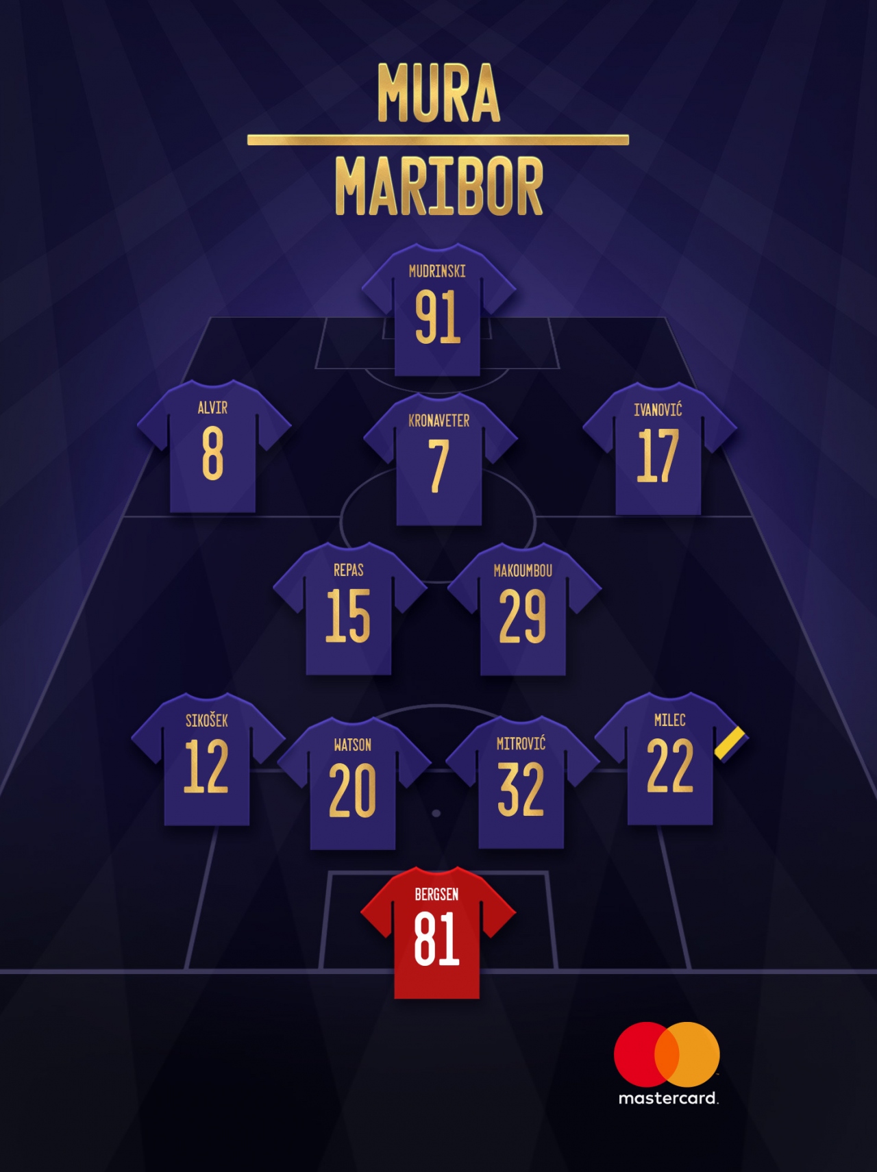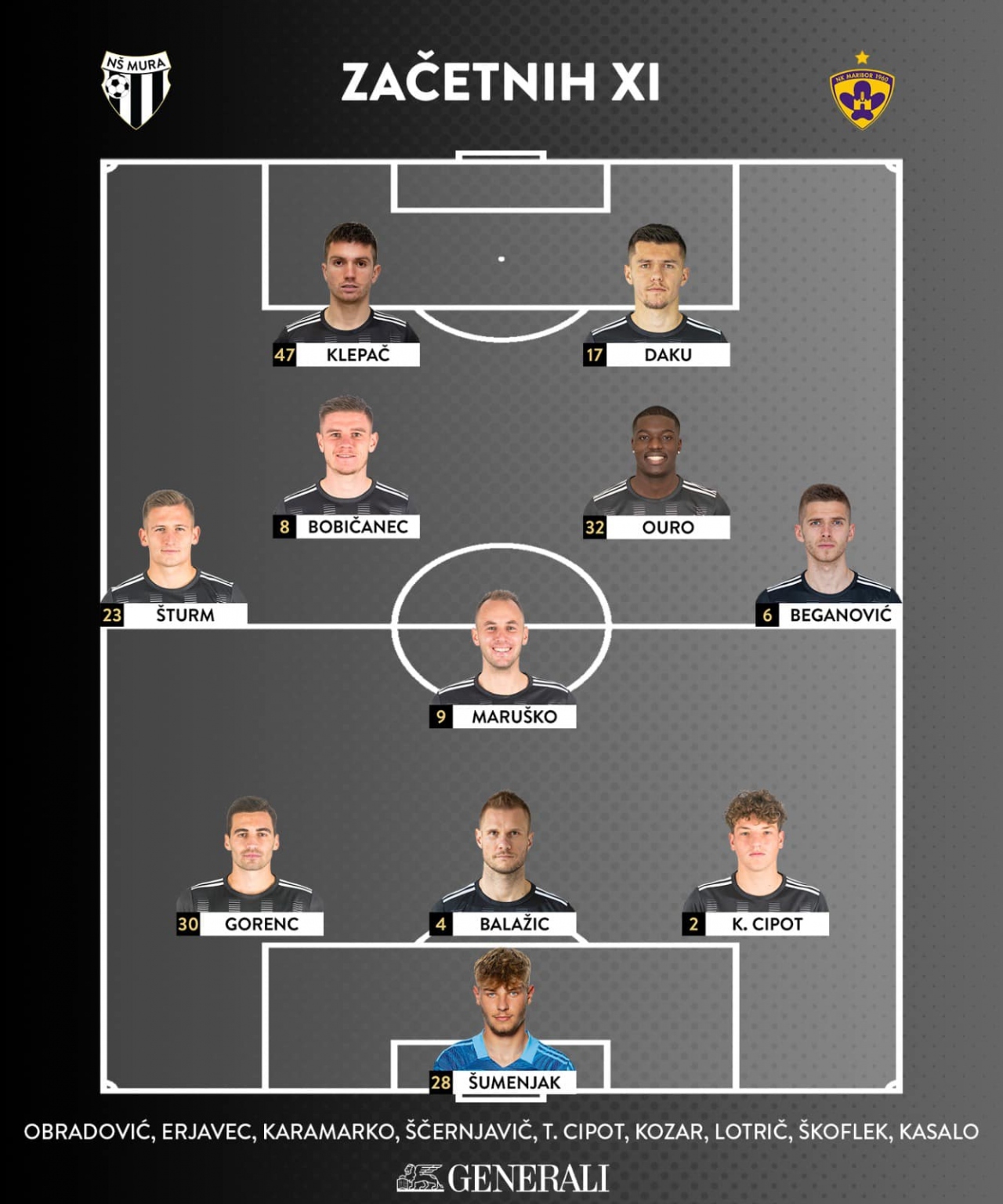 Maribor: Bergsen, Milec, Mitrović, Watson, Sikošek (od 73. Guerrico), Makoumbou, Repas, Alvir, Kronaveter (od 59. Žugelj), Ivanović (od 91. Pihler), Mudrinski (od 59. Sirk). Trener: Radovan Karanović.