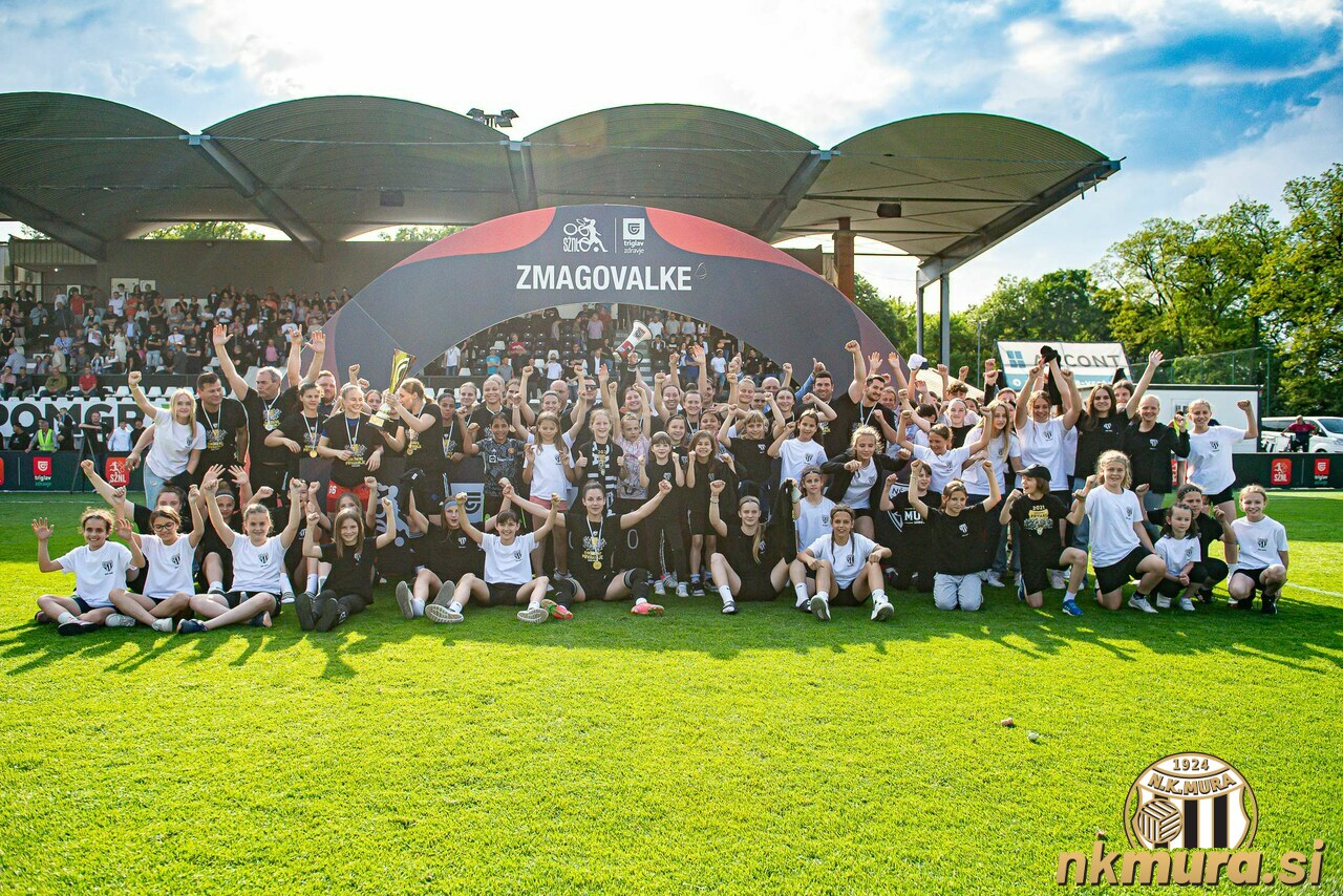 Skupinska fotografija mladih murašic in članic ob podelitvi pokala za naslov državnih prvakinj v sezoni 2022/23. Avtorske pravice: nkmura.si Foto: Aleš Cipot/fotolens.si