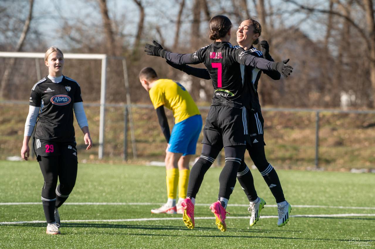 Veselje po doseženem zadetku. Od leve: Dolinar, Kolbl in Malakhova. Avtorske pravice: nkmura.si Foto: Boštjan Rous