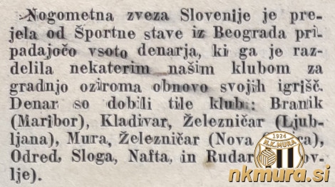 Nogometna zveza Slovenije je prejela od Športne stave iz Beograda pripadajočo vsoto denarja, ki ga je razdelila nekaterim našim klubom za gradnjo oz. obnovo svojih igrišč. Denar so dobili sledeči klubi: Branik, Kladivar, Železničar Ljubljana, Mura, Železničar Nova Gorica, Odred, Sloga, Nafta in Rudar Trbovlje.