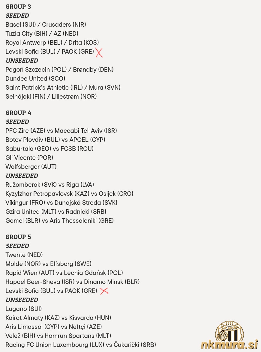 Če gre verjeti seznamu skupin na uradni spletni strani UEFE se je pri izdelavi le-teh pripetila napaka in obstaja verjetnost, da bodo skupine na novo formirane. Eden izmed možnih nasprotnikov Mure je zmagovalec dvoboja Levski Sofia / PAOK, ki ga je UEFA razvrstila tako v skupino 5 kot v skupino 3 v kateri je tudi Mura (fotografija spodaj). Kako bo krovna evropska organizacija rešila problem ostaja zaenkrat neznano.