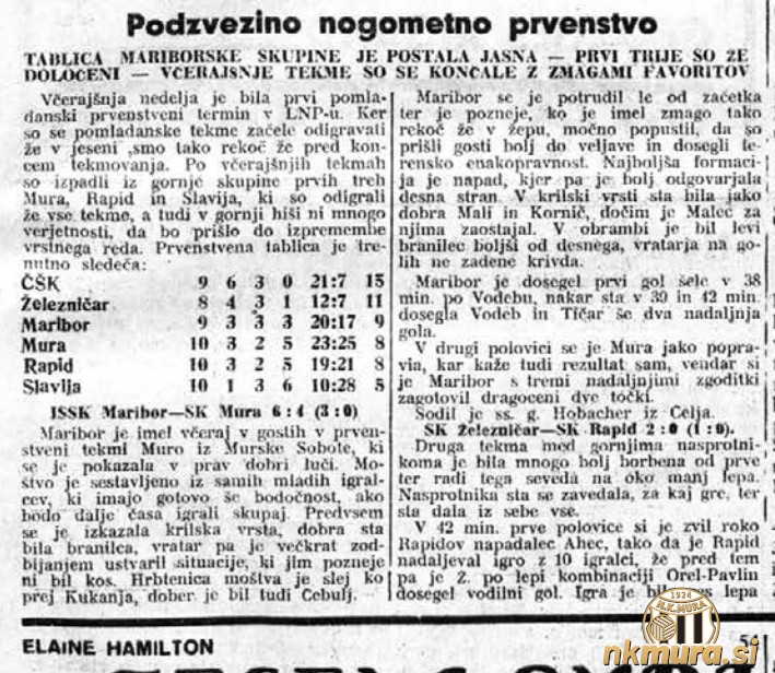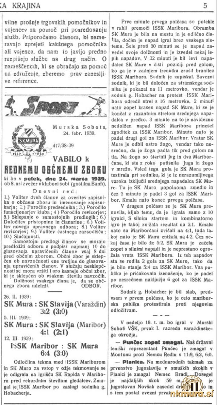 Nogometaši Mure so v Mariboru odigrali zadnjo in odločilno tekmo prvenstva 1938/1939. Z morebitno zmago bi črno-beli ohranili upanje na eno od prvih treh mest, ki prinaša nadaljnje tekmovanje za naslov podzveznega prvaka. Žal so črno-beli tekmo izgubili s 6:4. Zaostajali so že ob polčasu ko je bilo 3:0 za domačine.
