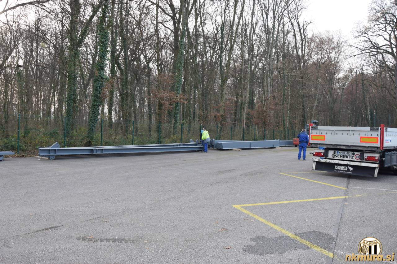 Na Fazanerijo počasi prihaja strešna konstrukcija za severozahodno tribuno. Vozili jo bodo sproti tekom celotnega tedna. Skladiščijo jo na parkirišču za igriščem z umetno travo.