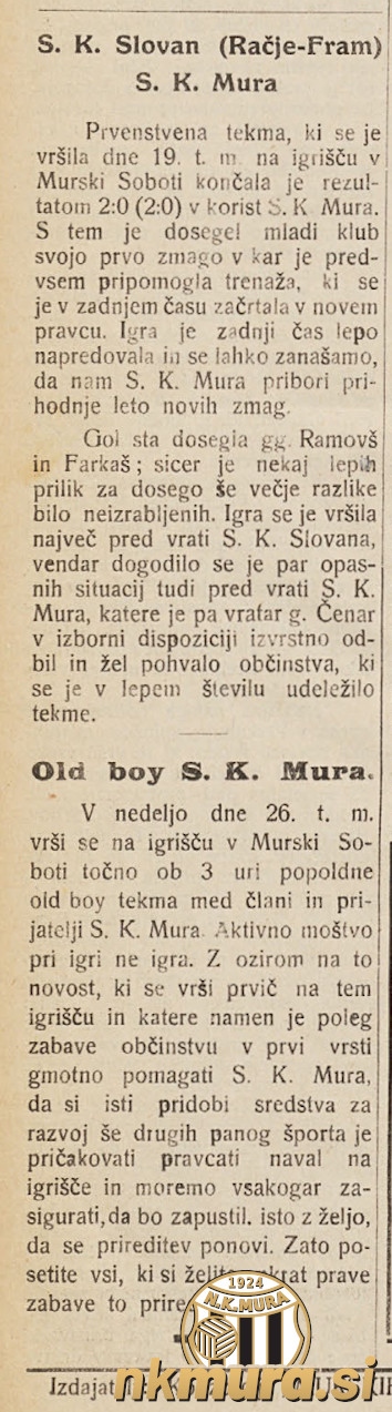 V nedeljo, 26. oktobra 1924 ob treh popoldne, je bila na igrišču Mure tekma med old boysi Mure in prijatelji Mure. Igralci prvega moštva ne bodo sodelovali na tej tekmi.