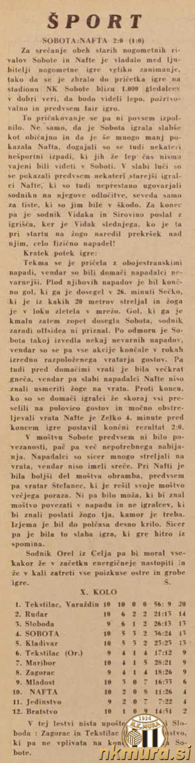 Nogometaši Sobote so v 10. krogu mariborsko - varaždinsko - celjske lige gostili lendavsko Nafto in slavili z 2:0 (1:0). Tekmo si je ogledalo okrog 1000 gledalcev.