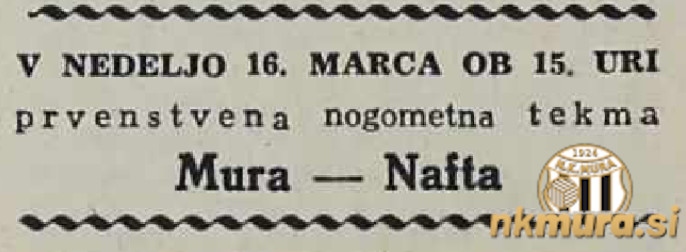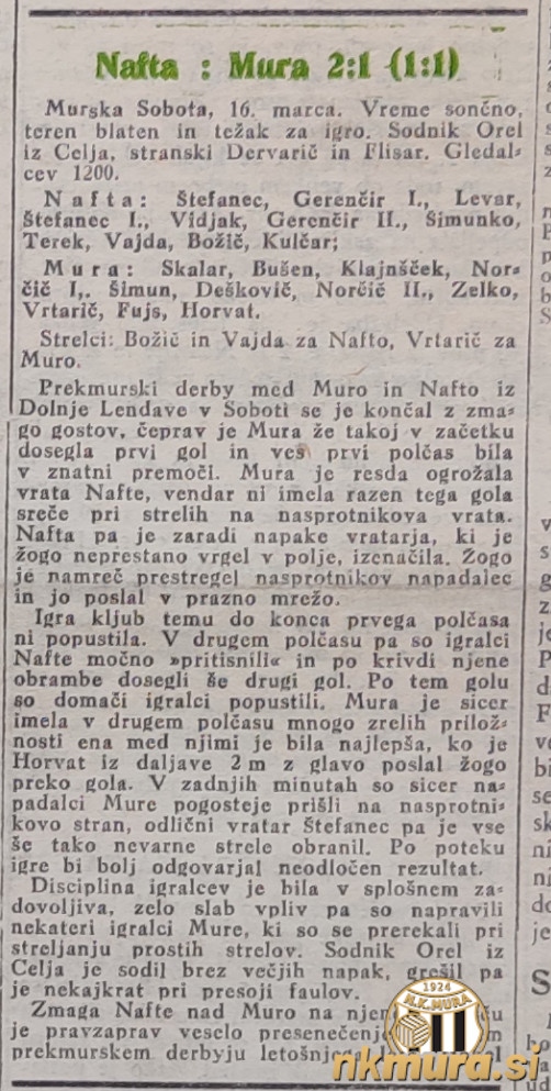 Za nogometaše Mure je bila to prva tekma v novi sezoni. Zaradi neugodnih vremenskih razmer in zasneženih igrišč so doslej vadili v telovadnicah. Začetni udarec na prekmurskem derbiju je imela Mura in takoj povedla. Zelko je lepo podal do Vrtariča, ki ni okleval in je s strelom po zemlji presenetil Štefaneca. V nadaljevanju polčasa so naši nogometaši še naprej ogrožali vrata gostov, vendar žoga ni hotela v mrežo. Nafta je izenačila po napaki vratarja, ki je danes prvič stal med vratnicama. Slavko Skalar je nespretno vrgel žogo v igro, Božić pa je izenačil na 1:1.