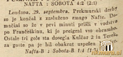V 2. krogu prvenstva mariborske podzvezne lige je Sobota gostovala v Lendavi in se v prekmurskem derbiju pomerila z Nafto. Lendavčani so zmagali s 4:2 (2:1).