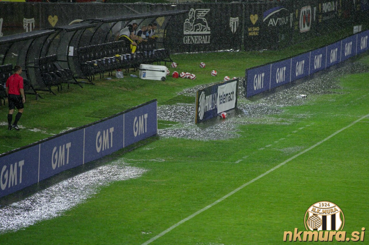 V začetku drugega polčasa se je deževje okrepilo, nad Fazanerijo pa se je razbesnelo neurje. Naliv je bil rako močan, da se je komaj videlo iz enega konca igrišča na drugega. Z nekaj menjavami so črno-beli krenili po zmagoviti zadetek. V 53. minuti so gostje v svojem kazenskem prostoru storili prekršek nad Lorbkom, ki je igrišče zapustil z zlomljenim nosom. Glavni sodnik Borošak je pokazal na belo točko, Amadej Maroša pa je streljal preveč po sredini, zato je Šugić njegov strel obranil. Naliv je bil vse močnejši in sodniki so v 60. minuti tekmo začasno prekinili. Igralci so se odpravili v slačilnice in čez deset minut je sodniška trojka preverila stanje na igrišču. Zaradi močnega naliva so nastale luže, žoga se ni odbijala, zato je bila edina razumna odločitev konec tekme.