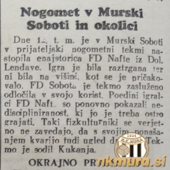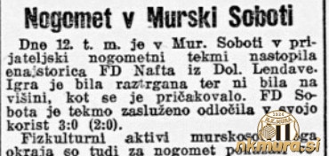 Nogometaši Sobote so v prijateljski tekmi gostili ekipo Nafte in zmagali s 3:0 (2:0). Zanimivo je, da bi se Sobočani morali na ta dan odpraviti v Ljubljano na pokalno tekmo FLRJ proti Krimu, vendar so raje odigrali tekmo z Lendavčani.