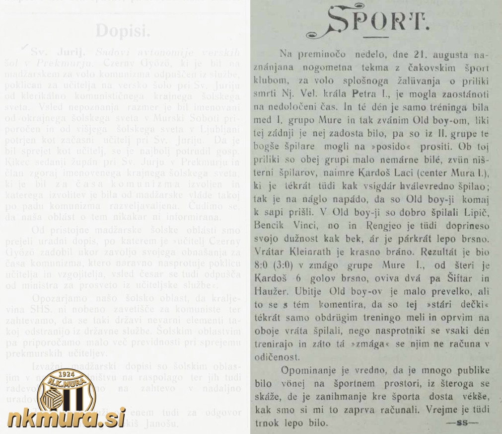 Namesto tekme s Čakovečkim Športskim klubom je Mura igrala z Old boy-i. Avtorske pravice: nkmura.si Foto: Prekmurski Glasnik, 28. avgust 1921