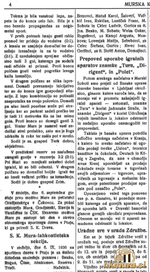 Tekma med Muro in Građanskim iz Čakovca bi sprva morala biti odigrana 23. avgusta 1936, vendar je bila zaradi slabega vremena preložena za teden dni. Čakovčani so v Murski Soboti gostovali s prvo in rezervno ekipo. Obakrat so zmagali gostje z 2:3.