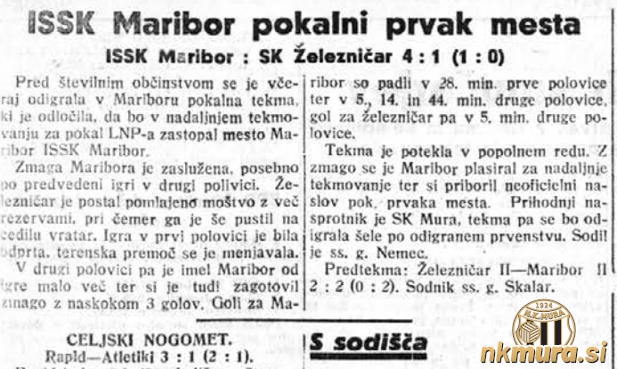Mura, ki se je jeseni 1938 z zmago na Čakovečkim Š.K. uvrstila v naslednji naslednji krog pokala LNP, je dobila nasprotnika. To je I.SSK Maribor, ki je s 4:1 premagal Železeničar.