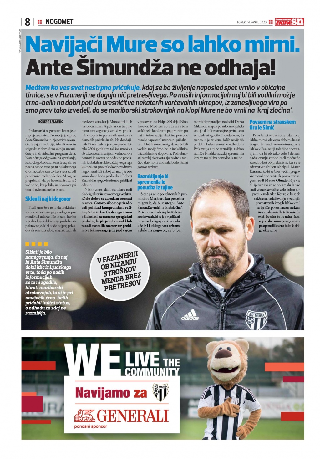 Tako so 14. aprila zapisali v časniku EkipaSN in šli po sledi namigovanj, da bi Ante Šimundža utegnil zapustiti klop Mure in se preseliti v Maribor. Šimundža bi razmišljanje spremenil le, če bi prišla mamljiva ponudba iz tujine.