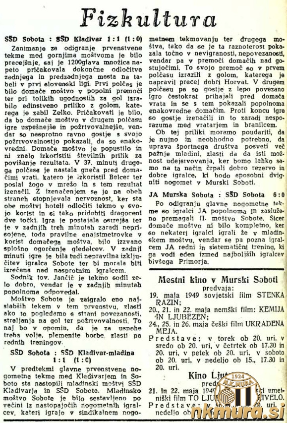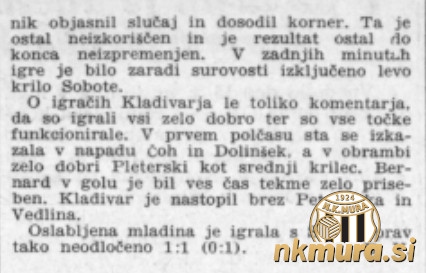 Nogometaši Sobote so v 14. krogu prvenstva na stadionu v Fazaneriji gostili celjski Kladivar in pred 1200 gledalci igrali neodločeno 1:1 (1:0). Tekma je bila zelo pomembna za obe ekipi, saj bi Sobočani v primeru poraza pristali na zadnjem mestu in izpadli v nižji rang tekmovanja.
