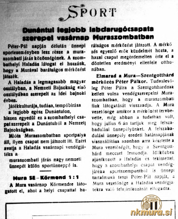 Nogometaši Mure so v nedeljo, 22. junija 1941 gostovali v Körmendu, kjer so se s Körmendijem razšli 1:1. Igra je bila enakovredna, remi pa pravičen.