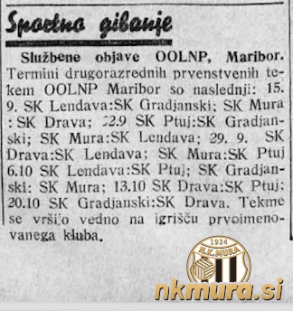 V prvi prvenstveni tekmi sezone 1935/1936 je Mura gostila Dravo iz Ptuja in igrala 2:2. Ob polčasu so vodili gostje z 0:2.