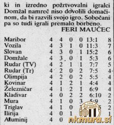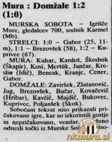 Nogometaši Mure tokrat niso prikazali pričakovane igre, kar so izkoristili gostje in nepričakovano, vendar zasluženo odnesli točki iz Murske Sobote. Visoki in izredno požrtvovalni igralci Domžal niso dovolili domačinom, da bi razvili svojo igro. Sobočani so igrali premalo borbeno.