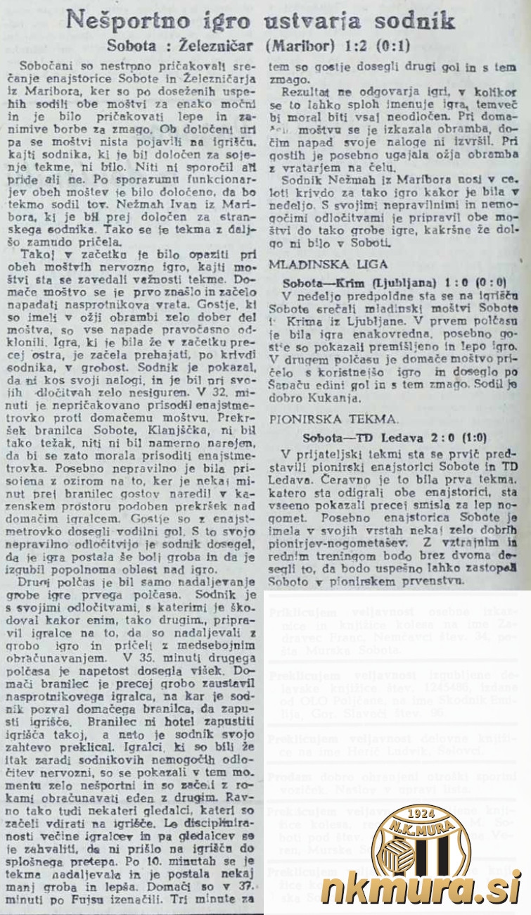 Končni rezultat ni bil odraz stanja na igrišču, bolj realen bi bil neodločen rezultat. Za grobo igro je v celoti kriv sodnik Nežmah, ki je s svojimi nepravilnimi in nemogočimi odločitvami obe ekipi pripravil do skorajšnjega pretepa. Kot je poročal Ljudski glas v Soboti že diolgo ni bilo tako grobe igre.